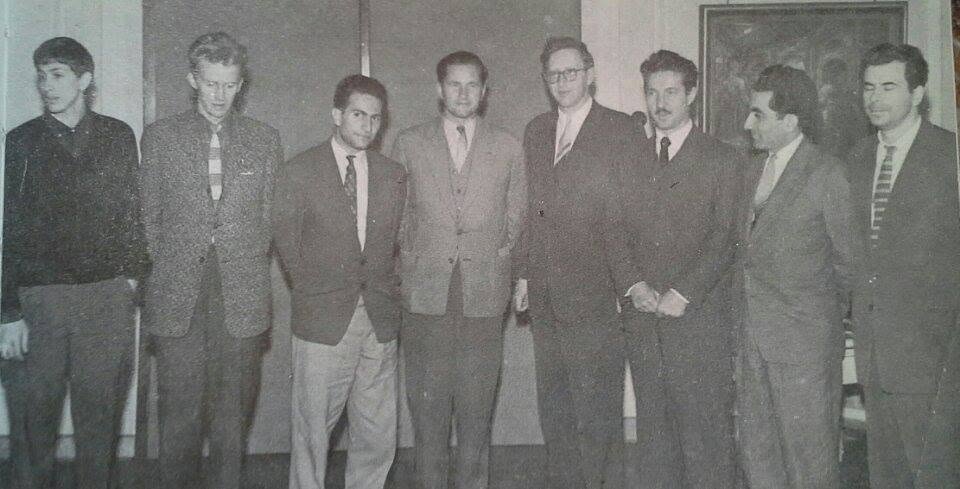 Я только что наткнулся на эту фотографию в Фейсбуке, и вспомнил, что видел её в Бледе, когда ездил туда на шахматную олимпиаду 2002 года. Групповое фото с турнира претендентов 1959 года: слева направо — Фишер, Олафссон, Таль, Керес, Смыслов, Глигорич, Петросян и Бенко.