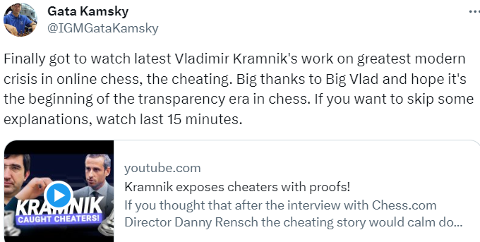 The most remarkable thing to me about Kramnik continuously and openly communicating his suspicions without substantial evidence, thus damaging reputations and ultimately the game itself, is that he doesn’t seem to have learned from Toiletgate at all.