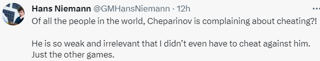 макс, вас читать где учили? чесс.ком и магнус признали, что они полностью и дословно подтверждают свою позицию включая то обстоятельство, что у них нет убедительных доказательств читерства ханса за доской. никто из них, разумеется, никогда и не говорил, что у них есть такие доказательства - если бы они были, их бы просто передали в фиде.