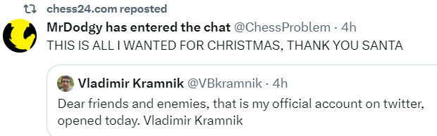 Carlsen today on muting Vladimir Kramnik on chesscom :
